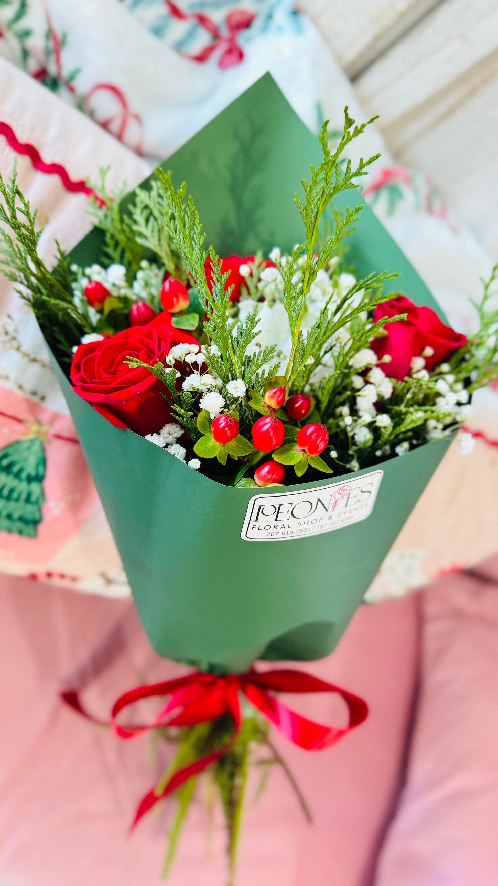 Hermoso bouquet con pino (cedro) rosas rojas, hypericum, baby breath, alstromelia blanca. Envuelto en hermoso papel Coreano verde y lazo rojo.