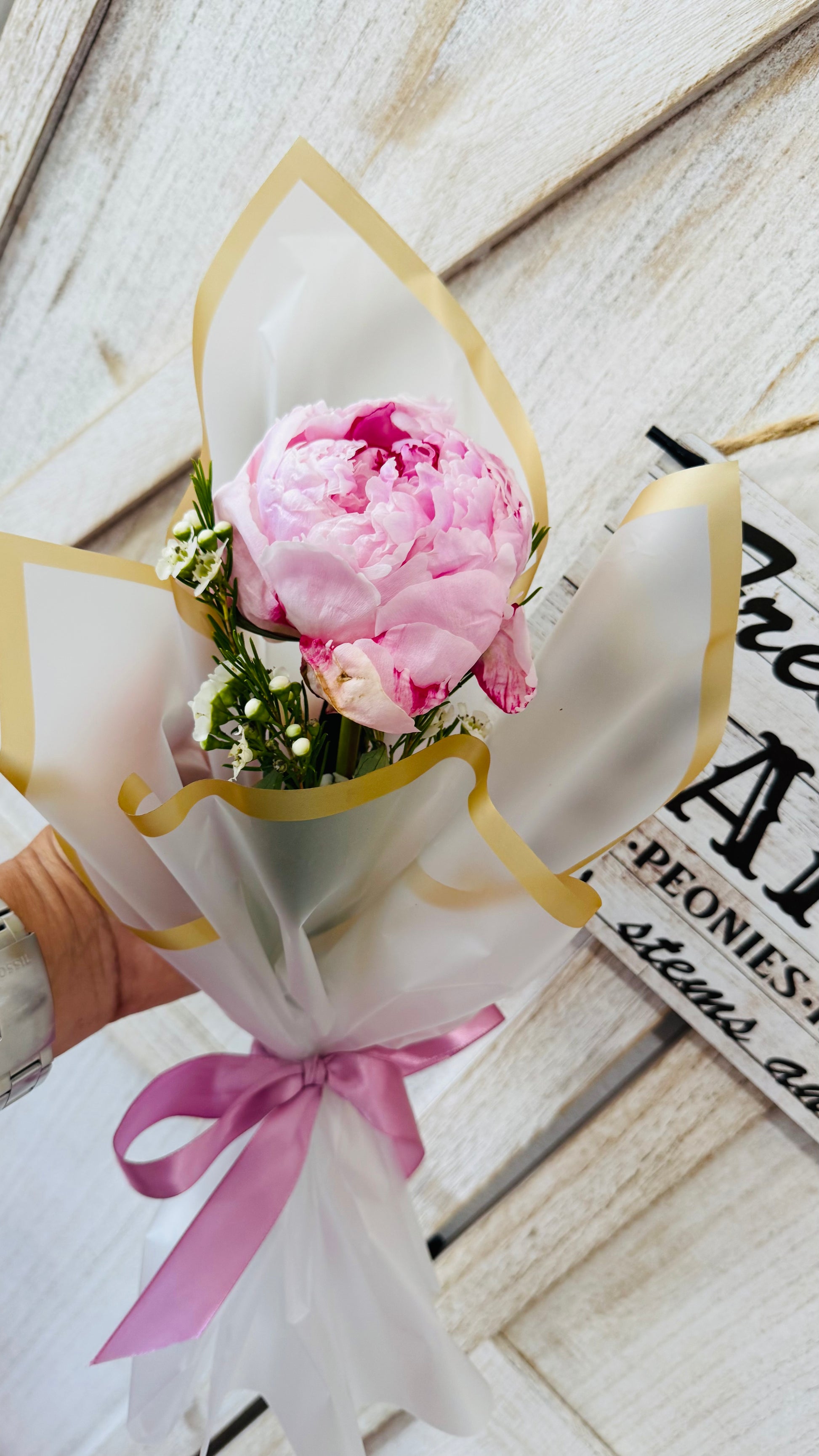 “Peonía solitaria con wax flower, envuelta en papel coreano. Un regalo minimalista y elegante, ideal para cumpleaños, aniversarios o para decir ‘te pienso’ con un toque de distinción.”