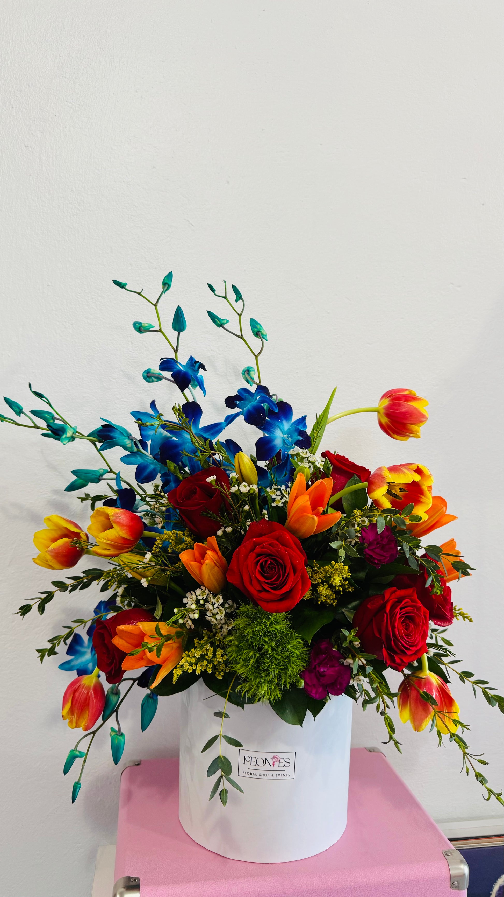 arreglo Con orquídeas azules, lirios blancos y rosas en tonos vibrantes de naranja y violeta, Glow Up Floral es perfecto para sorprender a ese ser especial que se merece lo mejor.