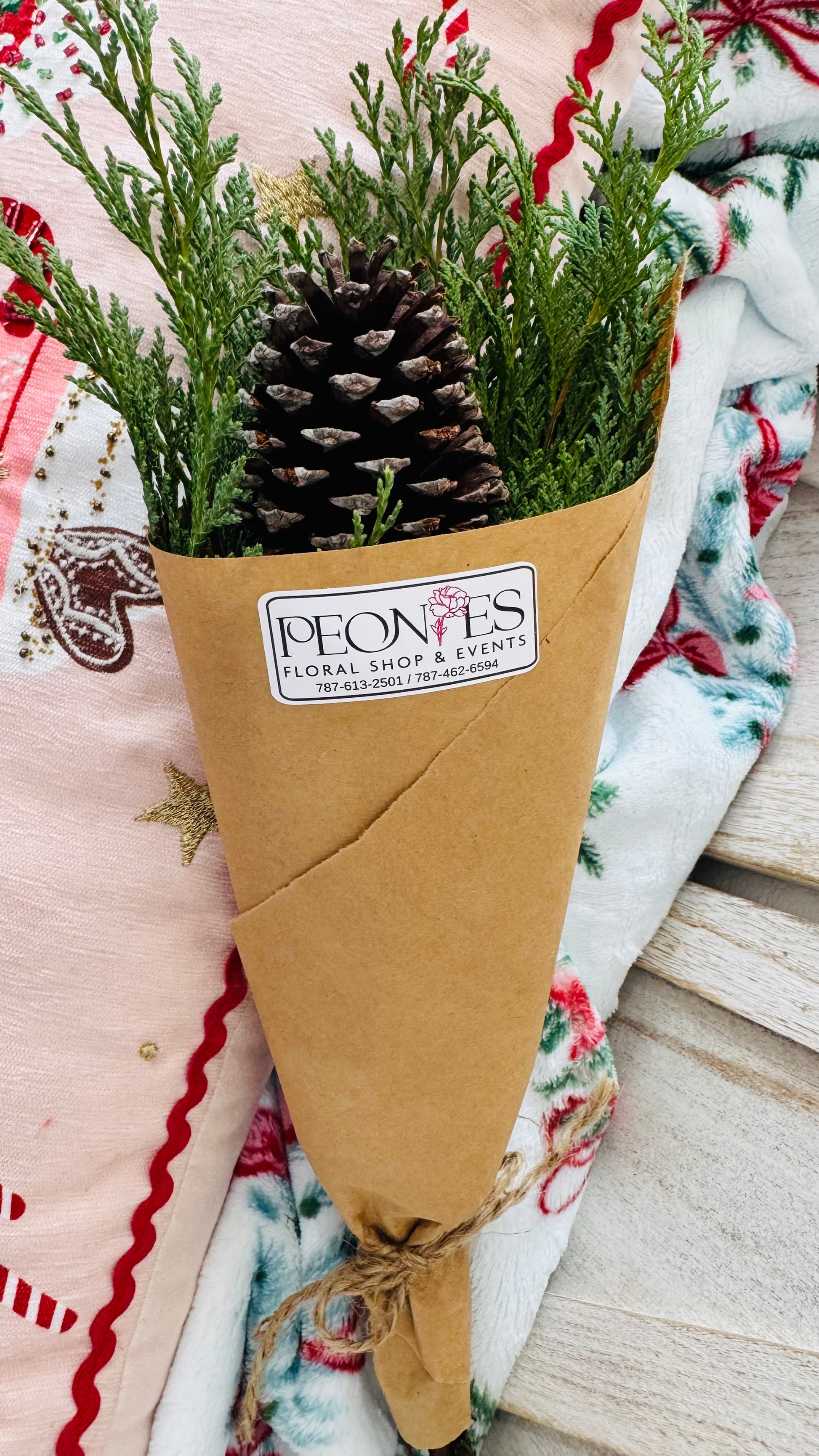 Nuestro Mini Bouquet Rústico Navideño es el detalle perfecto para llevar la Navidad a cualquier rincón. Diseñado con un estilo natural y acogedor, este bouquet combina follajes frescos de temporada con semilla de pino decorativa central, creando un acento festivo y lleno de textura.