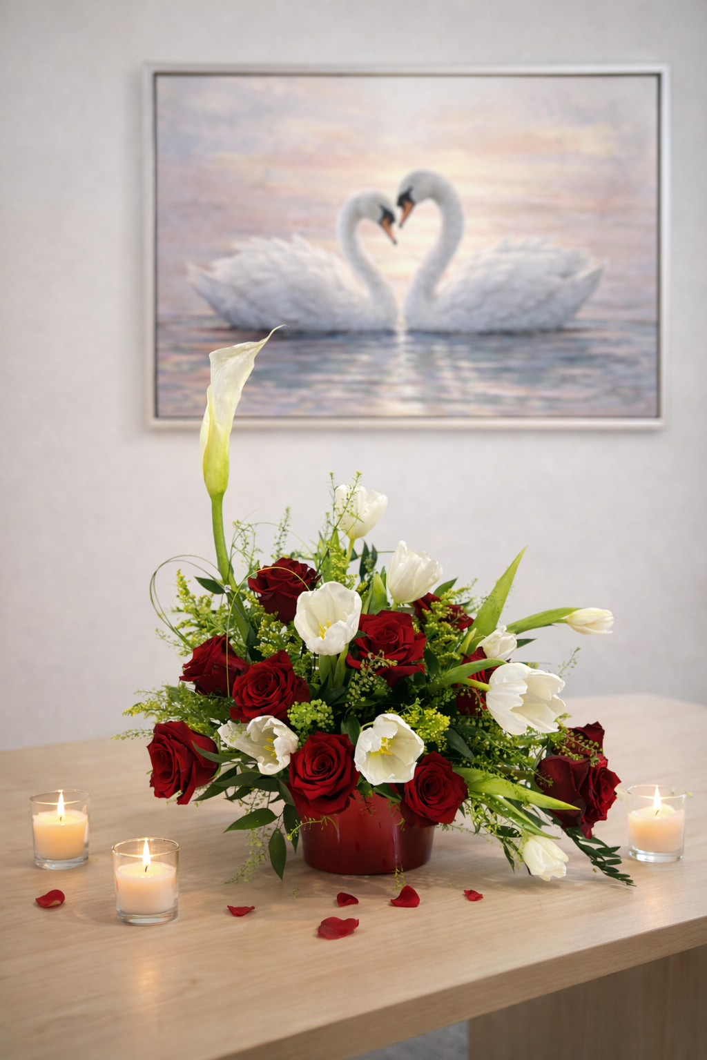 Por Siempre es una expresión de amor eterno, elegancia y romanticismo profundo. Este hermoso arreglo combina la pasión de las rosas rojas con la delicadeza de los tulipanes blancos y la sofisticación de dos lirios cala, creando una composición armoniosa y llena de significado.