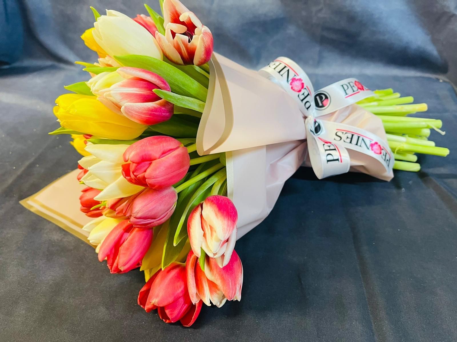 Un bouquet vibrante y delicado compuesto por 30 tulipanes frescos en una selección de colores disponibles al momento. Cada ramo es único y elaborado con dos o mas colores, creando una mezcla encantadora que transmite alegría, elegancia y frescura.